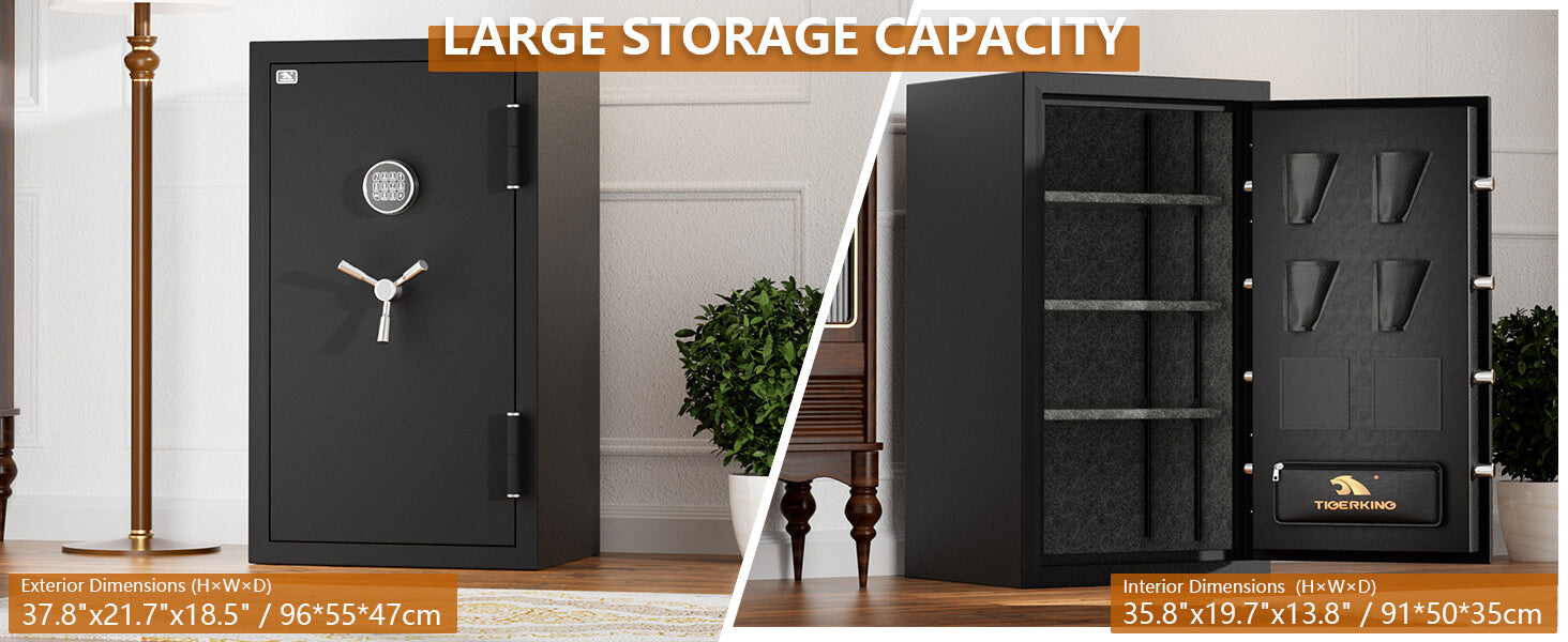 🔥PERFECT SIZE WITH SPACIOUS STORAGE - Exterior: 37.8" H x 21.7" W x 18.5"D; Interior: 35.8" H x 19.7" W x 13.8'' D; big safe weighs 217 pounds; Adventurer fireproof safe features a massive 8.78 cubic feet capacity. Three adjustable shelves allow you to organize valuables to your exact needs, while interior storage pouches behind the door ensure your valuables stay secure, organized.