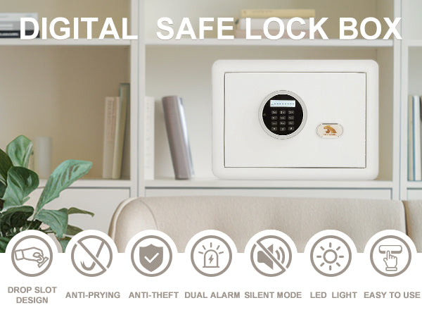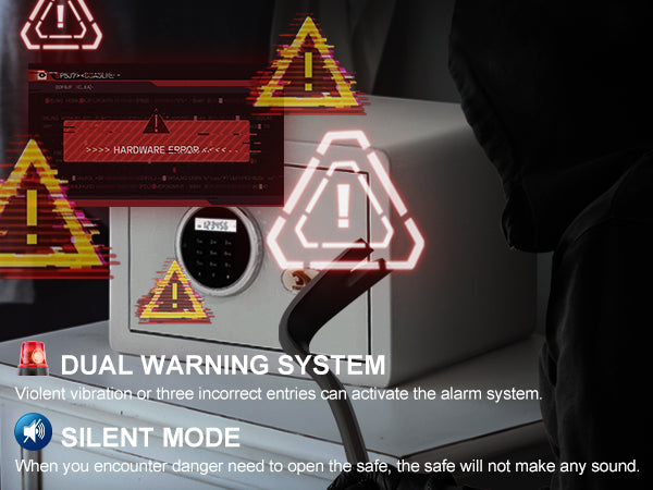【Dual Alarm System】The alarm system of the home safe will be activated by violent vibration or three wrong inputs, entering the correct password to stop the alarm. When the battery is low, "LO-BATT" will be displayed on the screen.