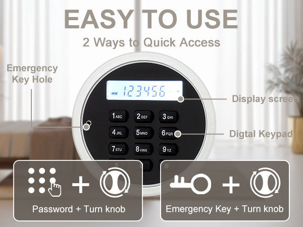 【LED Keypad】The safe is protected by an LED light-up keypad, which can be set with 3-8 digits password, open your safe with code quickly; equipped with 2 manual operation keys, if you forget the password, open the safe with keys, never worry about being locked in the safe outside.