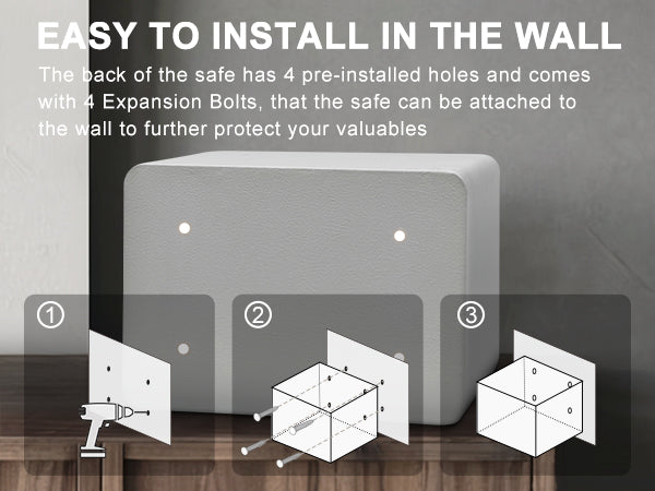 【Fashion & Security】The personal white safe box is modern desighed, will perfectly match the decoration style of your furniture and cabinet. Also it is anti-collision, anti-drilling and pry-resistant, equipped 4 pre-drilled holes in the back and bottom for wall or floor mounting(comes with 4 expansion bolts), to add more security.