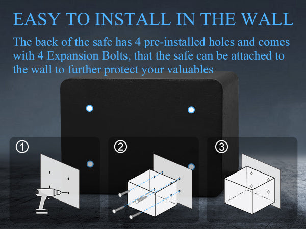 【Easy to Install and Incorporate】: With 4 Pre-drilled holes both in the back and bottom (comes with 4 mounting bolts), the safe can be easily fixed to the wall, floor, cabinet or shelf; The color exterior finish gives the safe a handsome look that will coordinate with any home or office setting.